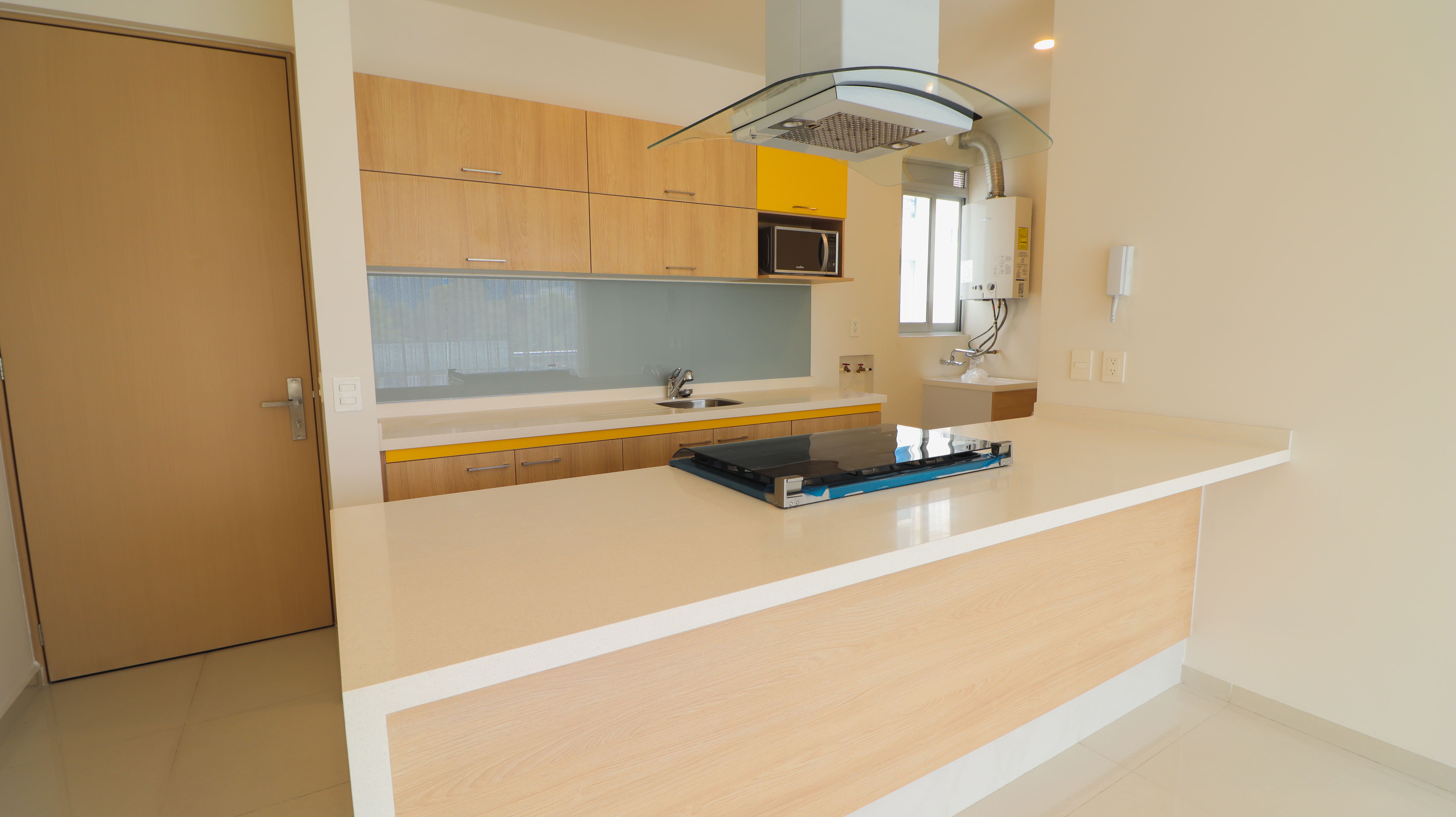 Sala, comedor, cocina equipada con campana y estufa, barra-desayunador, área de lavado.